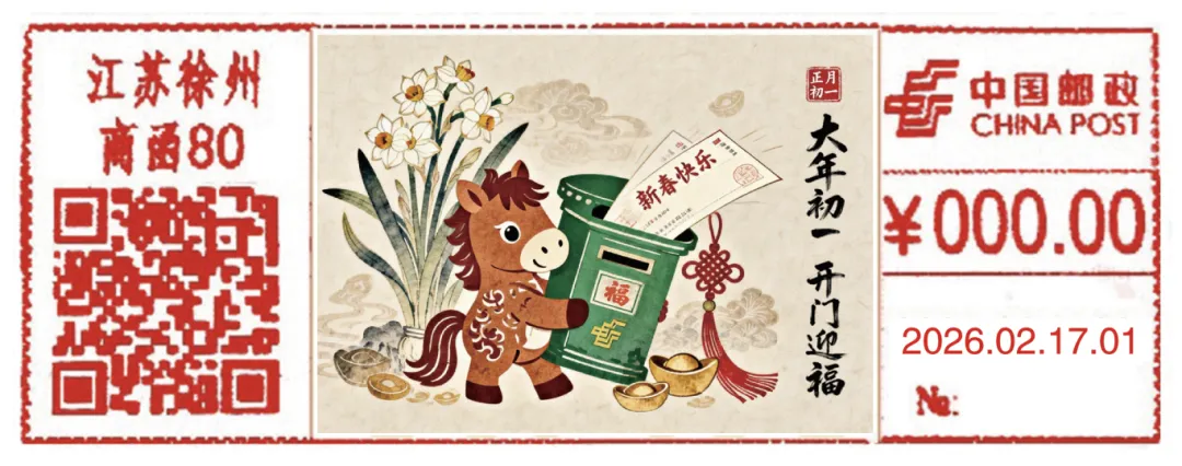 画面中央,一匹棕红色卡通骏马笑容可掬,亲昵怀抱着翠绿色邮政信筒。信筒中露出一封“新春快乐”的邮件,将“骏马驮春”的吉祥寓意与“邮政传情”的服务本质巧妙融合,构思精妙,温情跃然方寸之间。背景以古朴浅色底纹铺陈,辅以流动祥云点缀,构图饱满、层次分明。传统年味与邮政特色融为一体,既洋溢着节日的欢腾喜庆,更彰显了邮政文化的温度。