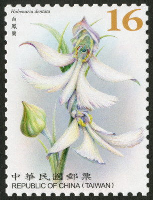 一、白凤兰 (面值16元):属中型地生兰,花白色,直径约2.5-3公分,花期为夏季至秋初时分,普遍分布于台湾中海拔山区向阳草生地或灌木丛。