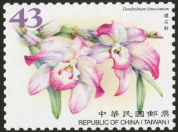 四、樱石斛 (面值43元):属中型附生兰,花中心近于白色,周围渐为紫红色,唇瓣基部有2紫色斑点,直径约5公分,花期在春季,分布于台湾北部中低海拔山区。