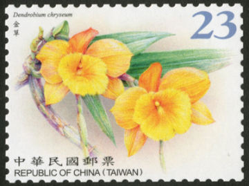 三、金草 (面值23元):属大型附生兰,花金黄色或略带橙色,直径约4公分,花期为春季至仲夏时分,普遍分布于台湾中高海拔山区。