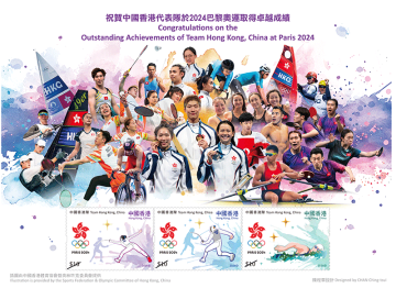 中国香港代表队于 2024 年巴黎奥林匹克运动会(下称「奥运会」)中凭着坚毅的决心,勇夺两枚金牌和两枚铜牌,是香港首次于同届奥运会中取得两金的佳绩,亦是首次连续两届取得奥运会奖牌。为纪念中国香港代表队在奥运会创下骄人的成绩,香港邮政发行一款以「祝贺中国香港代表队于 2024 巴黎奥运取得卓越成绩」为题的邮票小型张,展示中国香港代表队共 35 名运动员在比赛场上出色的表现。邮票小型张上嵌有一套三枚邮票,分别呈现了运动员在剑击及游泳赛事中竭尽全力角逐奖牌的一刻,并展现对体育的热爱及香港精神,触动人心。