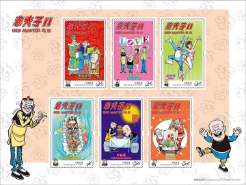 在这枚散发传统节庆与激昂气氛的邮票上,老夫子与伙伴上演一场别开生面的龙舟竞渡。 在邮票中央,一艘传统龙舟正在浪花中奋力前行,老夫子手持旗帜,在船头为团队导航; 大番薯则担任关键的鼓手,带动龙舟的节奏。 这枚邮票传达的不仅是「端午安康」的祝愿,更是那份「同舟共济」的深厚情谊。