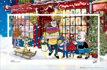 香港作为中西文化汇聚之都,每逢圣诞节都充满浓厚的节日氛围。 $ 20 邮票小型张以五彩缤纷的商店为背景,老夫子和大番薯化身成为「采购大军」,烘托出圣诞气氛,趣味盎然。 这枚邮票通过他们忙于采购的身影,表达欢乐节日前夕那种忙碌之中带有喜悦的独特氛围。