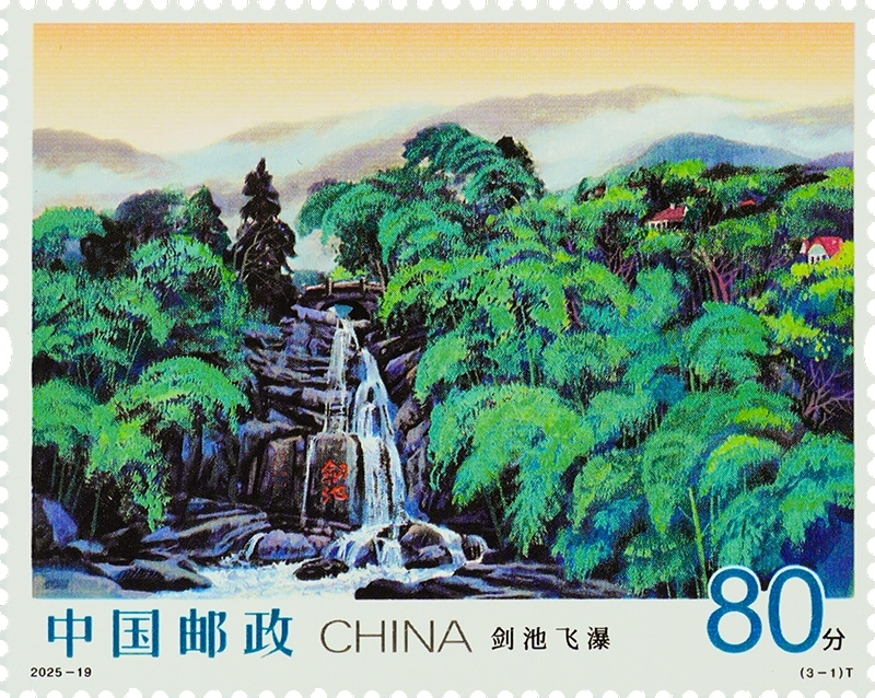 第一枚“剑池飞瀑”,叙述了莫干山的古老传说。邮票画面聚焦剑池瀑布自苍崖飞泻而下的刹那,与周边环绕的茂林翠柏、苍岩石壁共同讲述干将、莫邪铸剑的传奇故事。飞瀑如银、剑气如虹,激荡起亘古的回响,这既是造化钟神秀的自然杰作,更是莫干山厚重的历史根基。