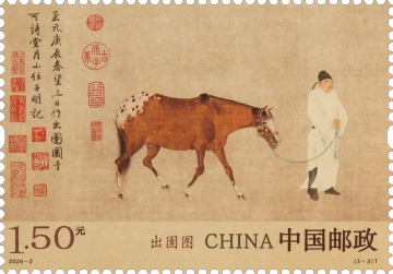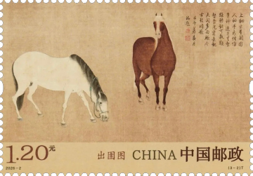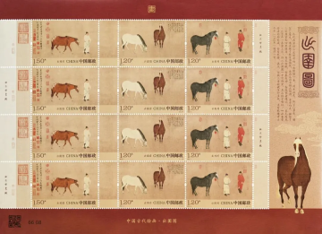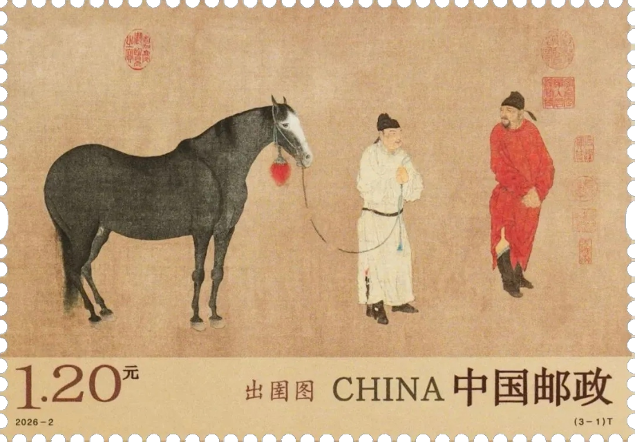 邮票大版设计以中国传统的暖棕、朱砂、米黄为边框色调,色彩过渡自然柔和,衬托出原画古朴典雅的独特韵味。右侧昂首的骏马与邮票主题元素相互呼应,强化主题的同时突出视觉焦点。该设计将元代宫廷绘画的笔墨神韵与历史质感精准传递,营造出沉静、厚重的文化氛围,让观者能直观感受古画的艺术张力。