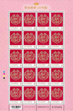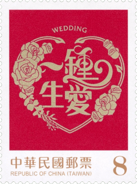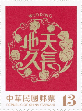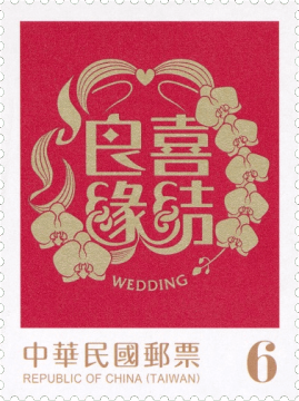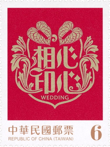 邮票图案特选取心心相印、喜结良缘、钟爱一生、天长地久等结婚贺词,分别搭配火鹤花、蝴蝶兰、玫瑰花及郁金香等婚礼常用花卉及配叶,采插画风格呈现,充满律动感的图纹衬以喜气的红色背景,传达结婚的喜讯及祝福。
