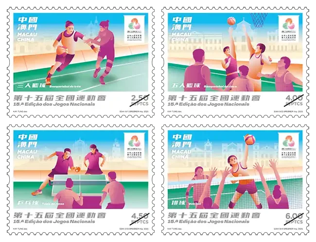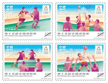 邮票设计聚焦于其中四项澳门赛事的精彩瞬间,将运动员的活力风采、澳门首度承办全运会项目的重要意义及澳门赛区的特色地标,完美融汇于方寸之间。